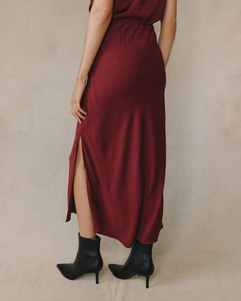 The Satin Side Slit Bias Maxi Skirt is a timeless silhouette designed to elevate everyday outfitting.